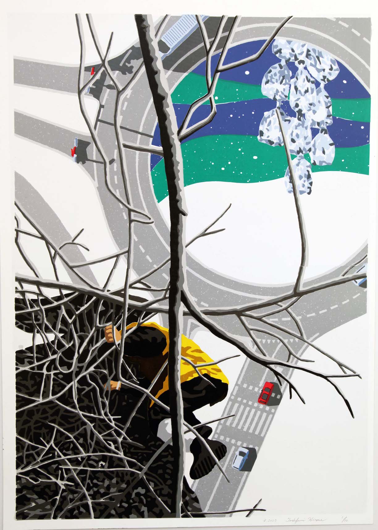 Der Druck entstand aus insgesamt 21 Druckvorlagen: Busch im Vordergrund: 4, Person: 9, runder Weg : 4, das Innere vom Kreis oben: 3, Grundierung: 1
