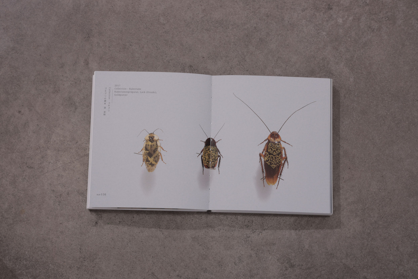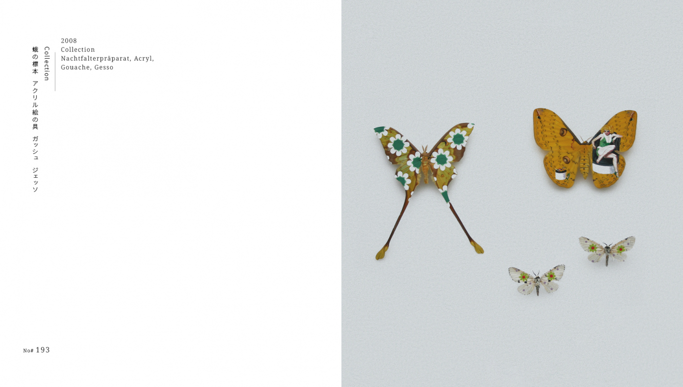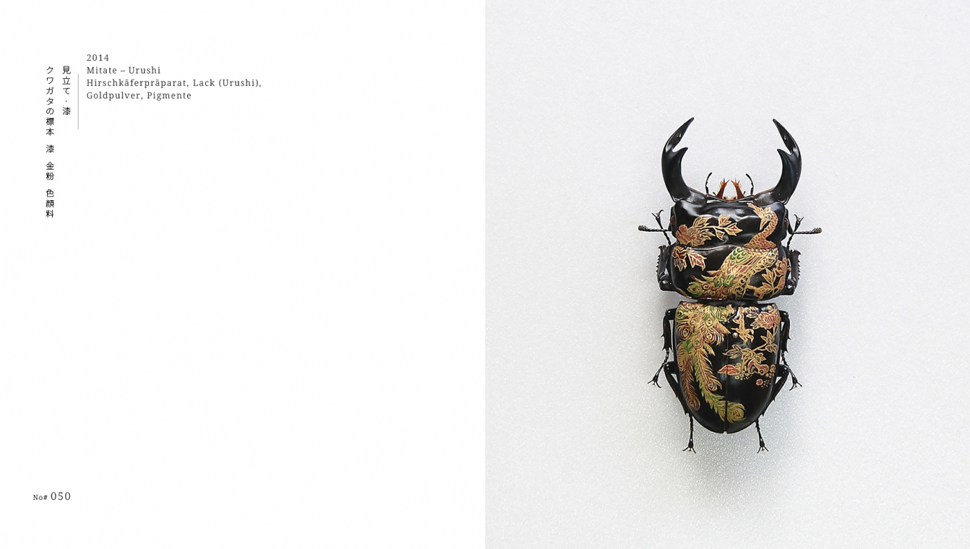 Akihiro Higuchi im handlichen Format eine Quelle der Inspiration: "Collection" mit wunderschönen bzw. humorvollen Mustern vierzierten, eigentlich unbeliebten Insekten wie Motten oder Kakerlaken, "Dino-Handtaschen" aus Spielzeug-Dinos, oder die Arbeiten aus der Serie "Restauration", für die der Künstler buddhistische Antik-Figuren mit eigenartigen Assoziationen "restaurierte".