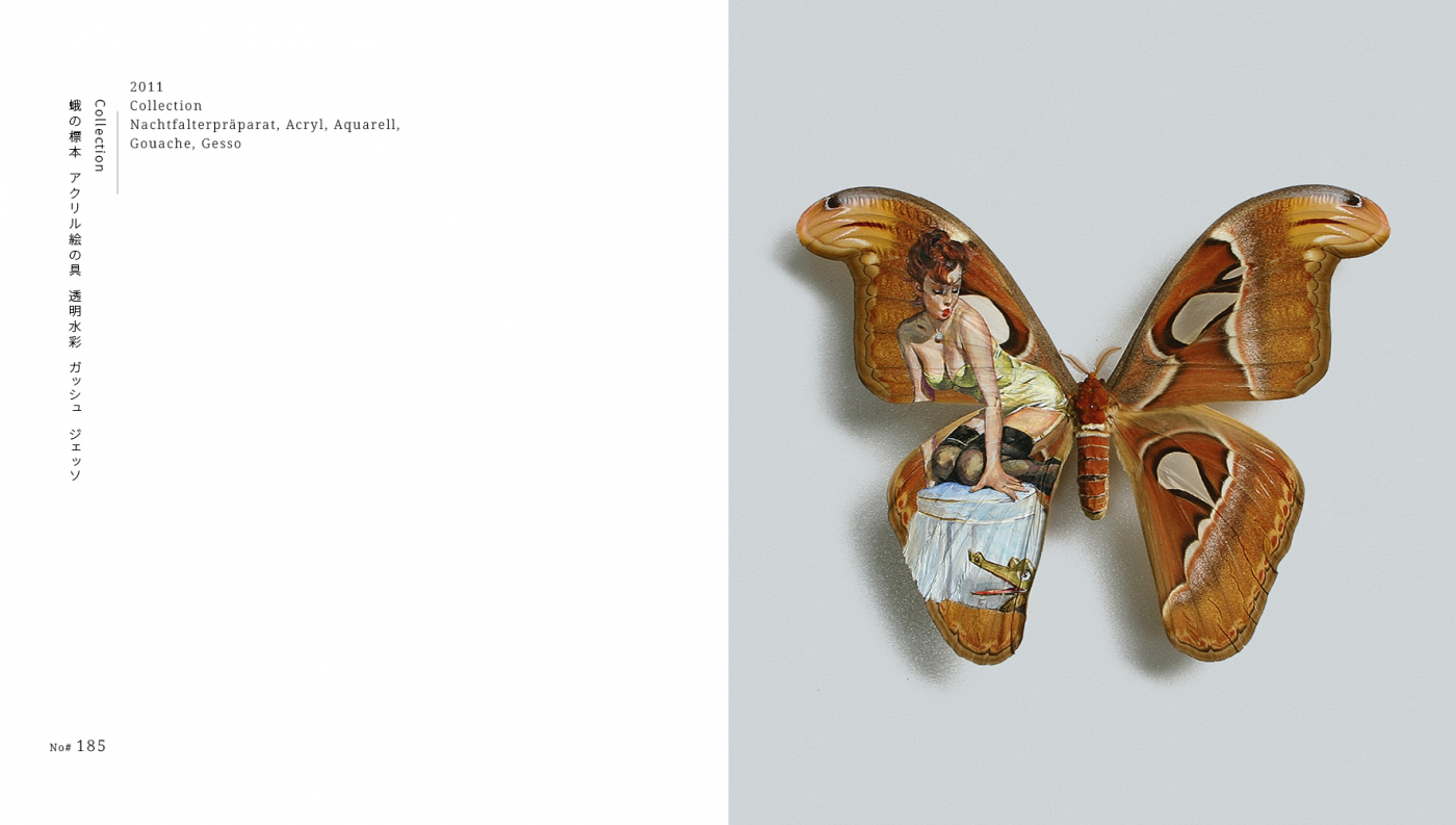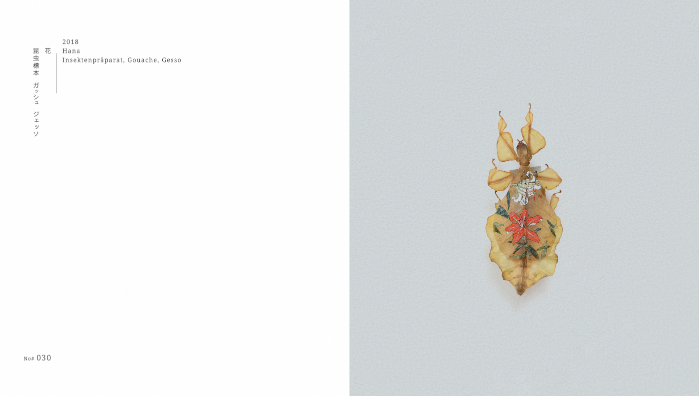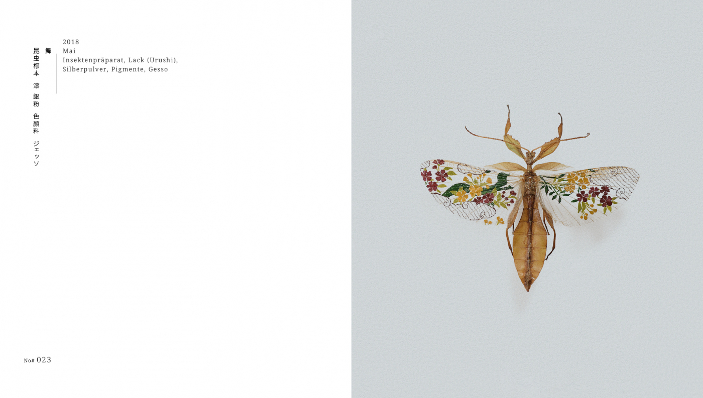 Akihiro Higuchi im handlichen Format eine Quelle der Inspiration: "Collection" mit wunderschönen bzw. humorvollen Mustern vierzierten, eigentlich unbeliebten Insekten wie Motten oder Kakerlaken, "Dino-Handtaschen" aus Spielzeug-Dinos, oder die Arbeiten aus der Serie "Restauration", für die der Künstler buddhistische Antik-Figuren mit eigenartigen Assoziationen "restaurierte".