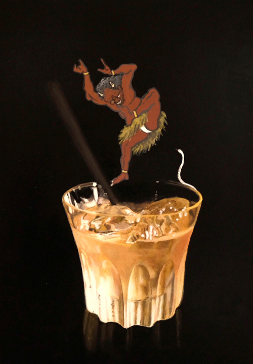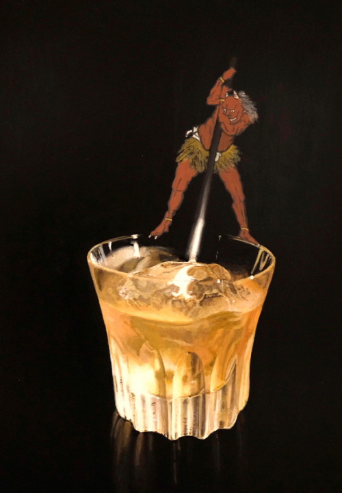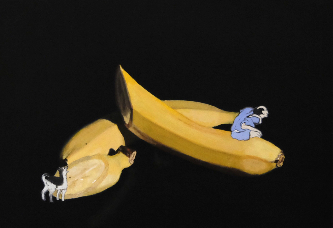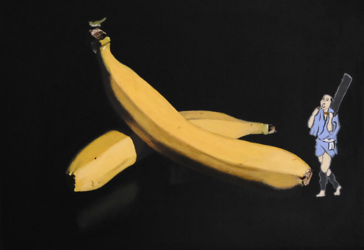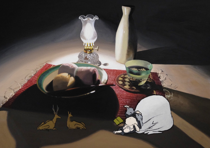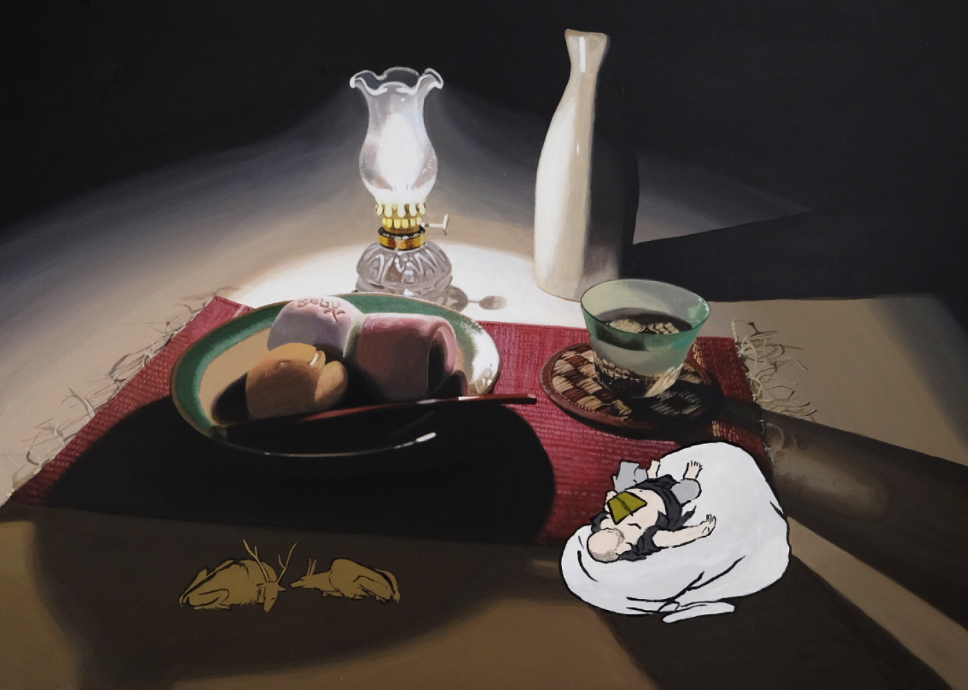 予期しない出会いは、芸術の世界では洋の東西を問わず古くから演出されてきた。たとえばヨーロッパではかつてシュルレアリストたちが「ミシンとコウモリ傘の偶然の出会い」に心を奪われたものだが、現代の橘内光則は自らの故郷の異なった時代の出会いを演出する。アメリカ式の朝食と古くから伝わる日本の神さまとが出会う橘内の絵画の中では、まさにタイムスリップが起こっているのだ。そこでは、江戸時代の日本と西洋の生活様式の影響を受けた現代の日本とが遭遇する。また同時に、橘内は日本におけるある伝統に着目している。同時代の絵師たちの作品に介入した奇想の絵師として知られる曽我蕭白(1730-1781)である。