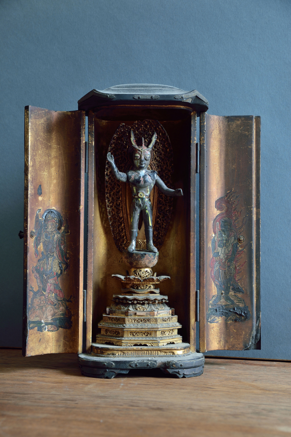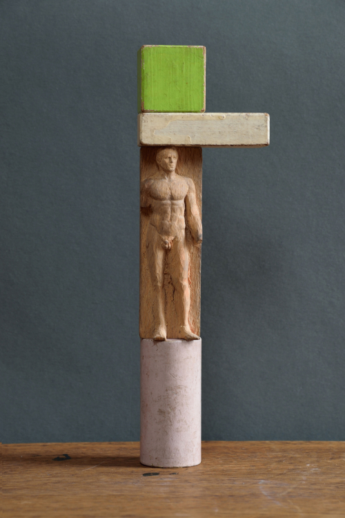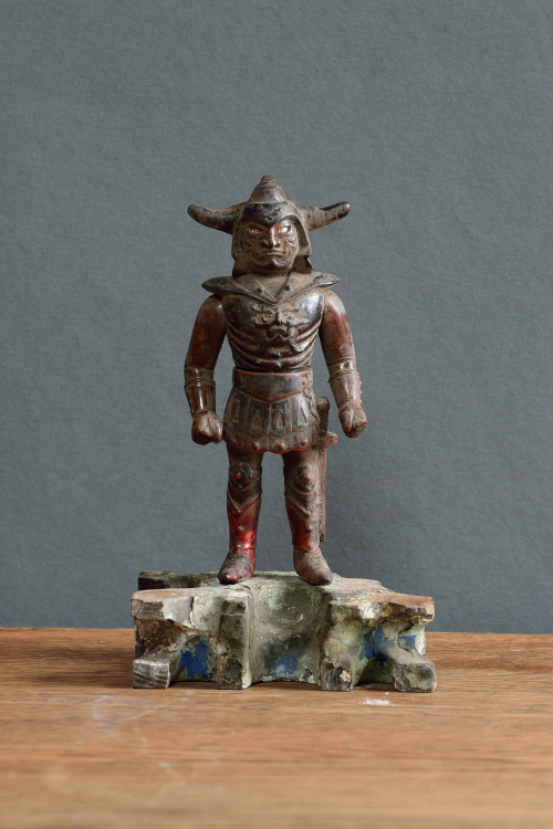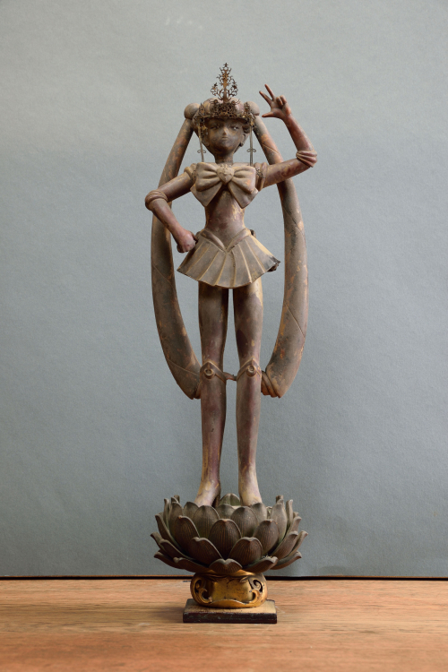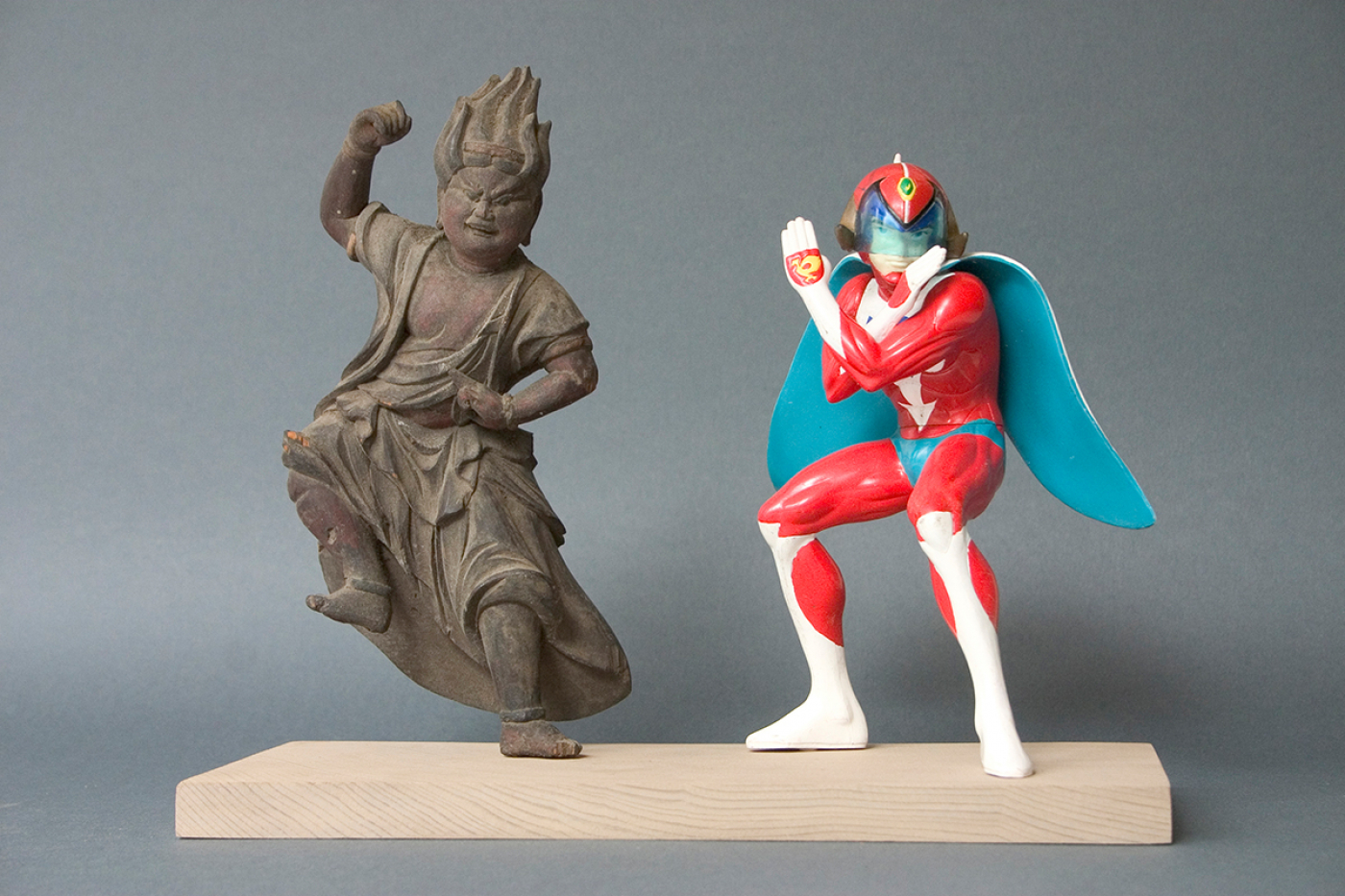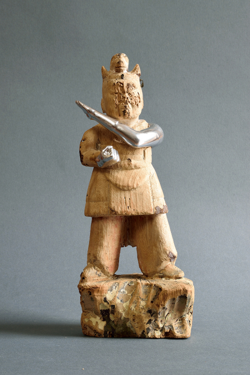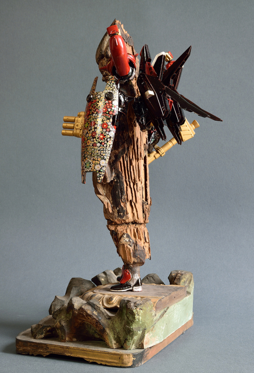 Mit der Ausstellung „Hero" freuen wir uns, Ihnen neue Arbeiten von Akihiro Higuchi zu präsentieren. Freunde der Galerie kennen sein Werk bereits von seinen farbigen Miniaturen auf Schmetterlingsflügeln. Oder von den textilen Mode-Entwürfen für Haus- und Wildtiere, die er in den vergangenen Jahren in den Räumen am Klosterwall zeigte. Dem Animalischen bleibt Higuchi auch in seiner neuen Ausstellung treu. Unter anderem werden präparierte Hirschkäfer gezeigt, deren Panzer er mit den Familienwappen namhafter Samurai-Geschlechter bemalt hat. Auch ihrer Form nach erinnern diese Käfer mit ihren gebogenen Zangen an die traditionell japanischen Ritter in voller Rüstung. Neben diesen Käfer-Heroen greifen das Ausstellungsthema weitere Skulpturen des Künstlers auf, Kombinationen aus Fragmenten antiker Götterskulpturen mit Gliedmaßen moderner Spielzeugfiguren. Für den Künstler verbinden sich in ihnen Kindheitserinnerungen mit den Akteuren des japanischen Götterhimmel, indem die Heroen der japanischen Götterwelt einen Rollentausch mit den Kämpfern und Gladiatoren des modernen Spielzeugkosmos vollziehen. „Spielfiguren" so der Künstler stelle ich „als religiöse Skulpturen dar, oder behandle religiöse Skulpturen als wären es vertraute Helden unserer Kindheit." Da passt es gut ins Bild, dass der Künstler seine kombinierten Heroen als „Restaurierungen" betitelt. Als wäre das Alte wie das Neue der jeweils passende und vollwertige Ersatz für die fehlenden Teile an den antiken beziehungsweise modernen Figuren.